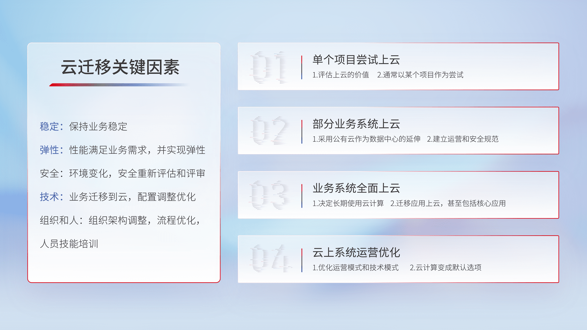 结合实际业务,,,从规划设计、、、、云平台选型、、云原生改造、、、数据迁移、、、集成交付,,,,迁移全过程为客户识别最佳上云路径,,,做好风险识别管理,,设计网络架构、、、身份权限、、、安全审计合规、、、、操作审计、、、、日志审计、、、、监控告警策略、、、、多站点容灾设计等,,对云上基础设施进行整体规划,,提升IT治理水平,,以满足弹性、、、高可用、、高性能的需求。。。